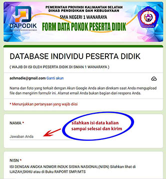 Informasi untuk semua peserta didik baru di SMAN 1 Wanaraya WAJIB mengisi dan melengkapi database individu sebagai persyaratan untuk masuk ke database DAPODIK, waktu pengisian paling lambat sampai dengan tanggal 17 Juli 2023. silahkan klik link berikut untuk mengisi data nya. FORMULIR DATA POKOK PESERTA DIDIK BARU SMAN 1 WANARAYA , maka akan tampil formulir data untuk dapat mengisinya harus login terlebih dulu dengan akun email google kalian, kolom yang bertanda * ( tanda bintang berwarna merah ) berarti WAJIB DIISI tidak boleh kosong, jika sudah berhasil lanjutkan isi data kalian geser atau scroll ke bawah dan silahkan pilih KIRIM jika sudah selesai mengisi form data nya